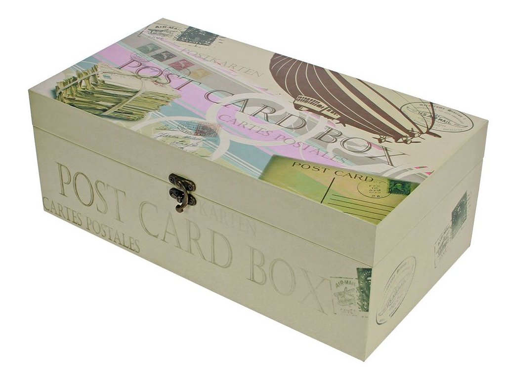 Krásně navržený dřevěný box v retro vzhledu na fotografie a pohlednice. Box je dekorativní a robustní. Uvnitř jsou 4 přihrádky, do kterých se vejde až 600 karet nebo fotografií. Kufr je polstrovaný, všitý polštář, Kování, zavěšená mosaz. Rozměry: Š 200 x V 140 x D 360 mm.