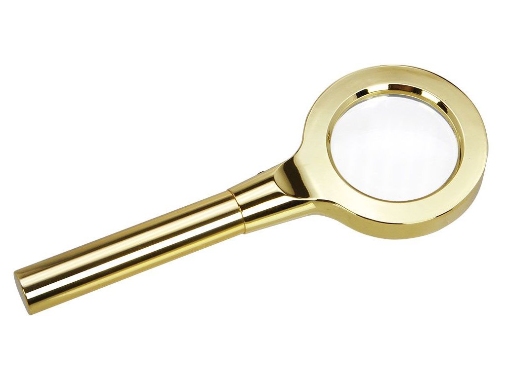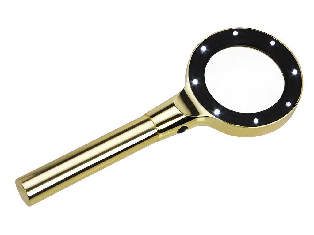 Kovová lupa s LED osvětlením ve zlaté barvě. Průměr čočky: 55 mm - zvětšení 2,5x